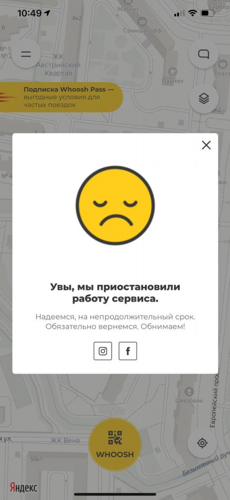 В Санкт-Петербурге перестали работать все сервисы, предоставляющие электросамокаты в аренду, в том числе Whoosh, Molnia, Urent, Eleven и Busy-Fly. Например, пользователи Whoosh видят в приложении такое уведомление: