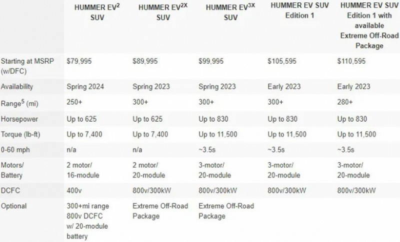Hummer EV SUV будет выпускаться в разных версиях, которые отличаются друг от друга мощностью, запасом хода на заряде и другими характеристиками. Модель Hummer EV SUV Edition 1 и её версия с расширенной комплектацией EV SUV Edition 1 with Extreme Off-Road Package будут выпущены в начале 2023 года по ценам 105 595 и 110 595 долларов.