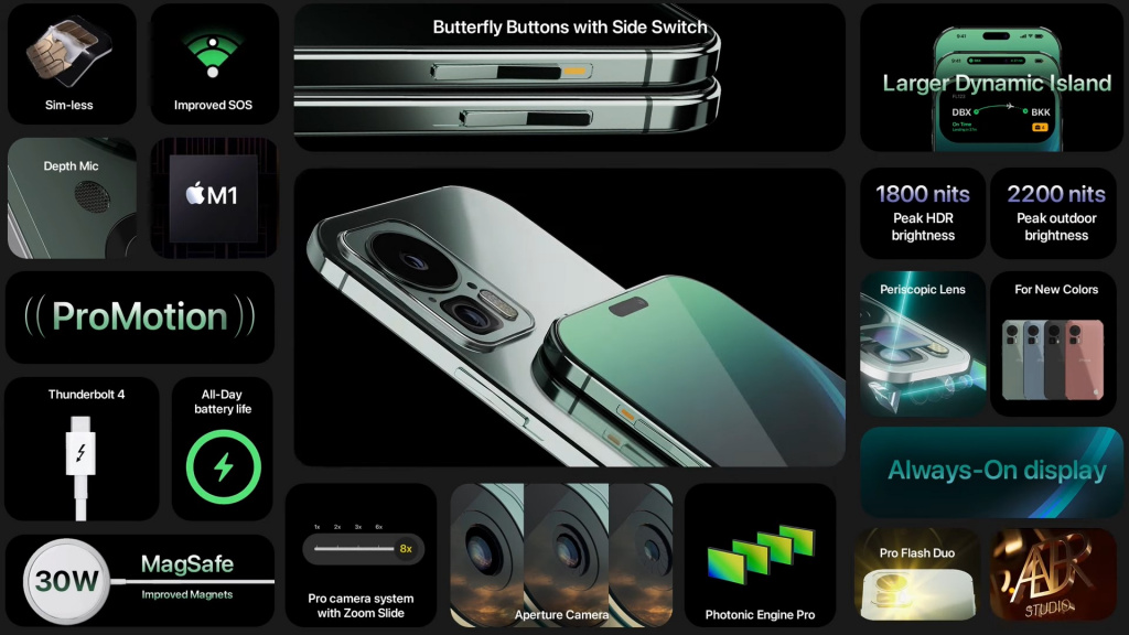 Короткий ролик дизайнер выложил на своем YouTube-канале. Согласно спецификациям (и мечтам художника), корпус iPhone 15 Pro Max должен быть выполнен из титана. Фирменное яблочко переместилось с центра в правый нижний угол. Модуль основной камеры состоит из двух объективов, один из которых перископический, и двойной вспышки. Качелька громкости выполнена в виде слайдера. Ее функциональность не совсем понятна, но, вероятно, это сенсорные клавиши совмещённые с кнопкой беззвучного режима. За производительность будет отвечать процессор М1. Смартфон сменит привычный порт Lightning на USB-C с поддержкой Thunderbolt 4, а MagSafe будет поддерживать мощность до 30 Вт.