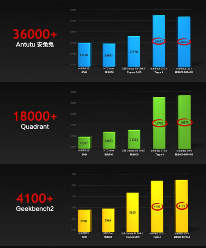 Xiaomi позиционирует свой смартфон как самый быстрый в мире. Дело в том, что в нем используется «разогнанный» Snapdragon 800 с повышенной тактовой частотой. Относительно предыдущего флагмана Mi2S производительность выросла на 40%.
