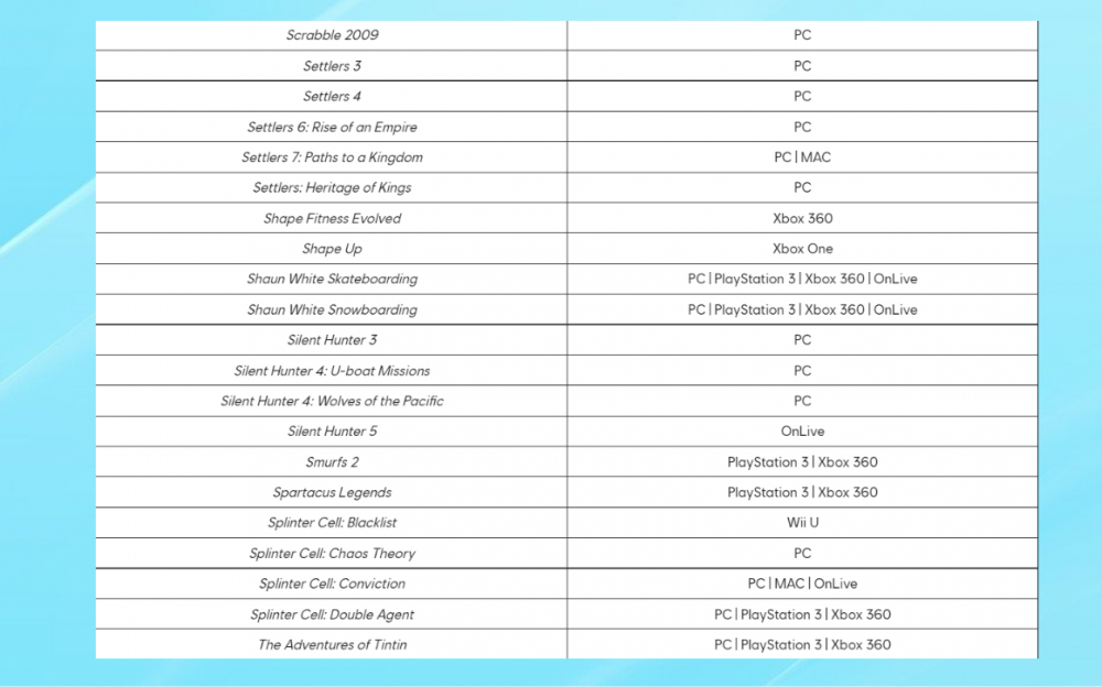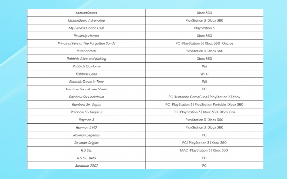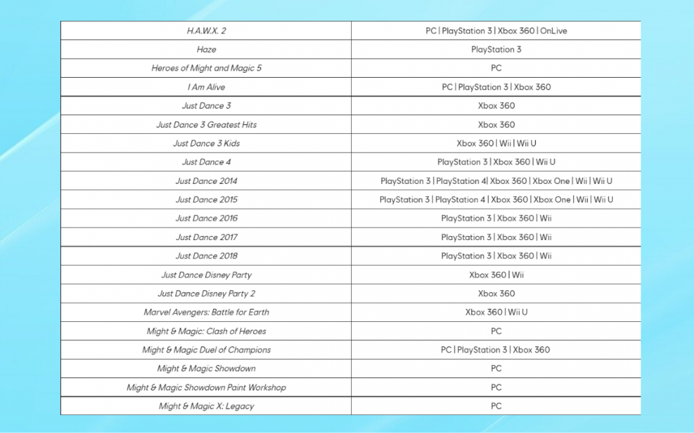 Большинство игр относится к консолям Xbox 360 и PlayStation 3. Однако в списке есть проекты, которые исчезнут со всех платформ. Среди них военный авиасимулятор Hawx, тактический шутер Rainbow Six Vegas, стратегия с голосовым управлением End War и многие другие.