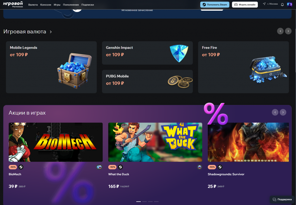 «Ростелеком» представил игровую онлайн-платформу «Ростелеком Игровой», на которой представлено более 3000 игр для ПК и консолей, в том числе те, что официально не продаются в России на иностранных площадках. В каталоге есть как инди-проекты, так и крупные релизы вроде Helldivers 2 и Warhammer 40000: Space Marine 2. Особенностью сервиса стала возможность пополнения баланса в Steam и других зарубежных магазинах, что актуально в условиях ухода международных платформ с российского рынка.