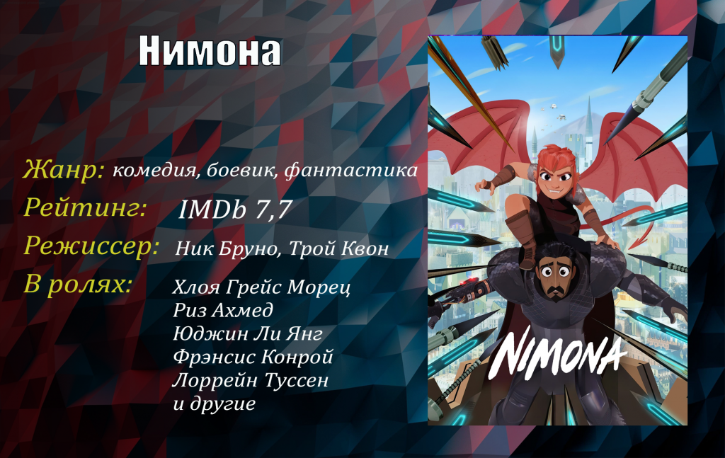 Экранизация веб-комикса о девочке-оборотне Нимоне, которая готовит революцию. Мультфильм переносит зрителя в красочный средневековый стимпанк, где благородные рыцари перемещаются по ночным клубам на летающих досках. Юная девушка обладает сверхспособностью превращаться в любое из известных существ. Она поступает на службу к разжалованному рыцарю Баллистеру Блэкхарту, который мечтает вернуть себе доброе имя, отомстить обидчикам и попутно устроить государственный переворот.