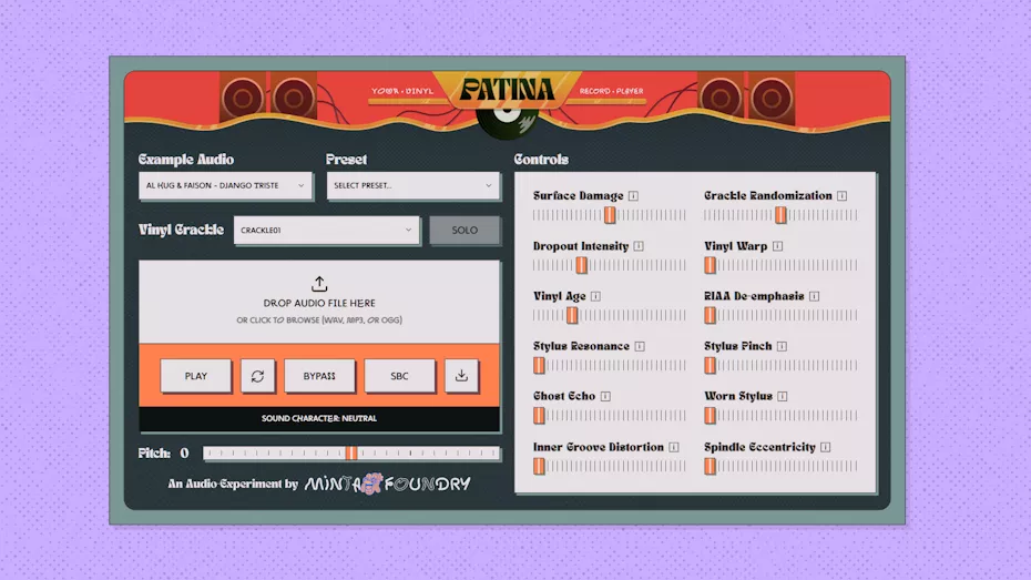 Компания Minta Foundry, разрабатывающая музыкальные плагины, создала бесплатный эмулятор винилового проигрывателя — Patina. С его помощью можно послушать любой трек так, будто он записан на пластинку, причём пользователь может выбрать степень изношенности пластинки и качество звуковоспроизводящего устройства.