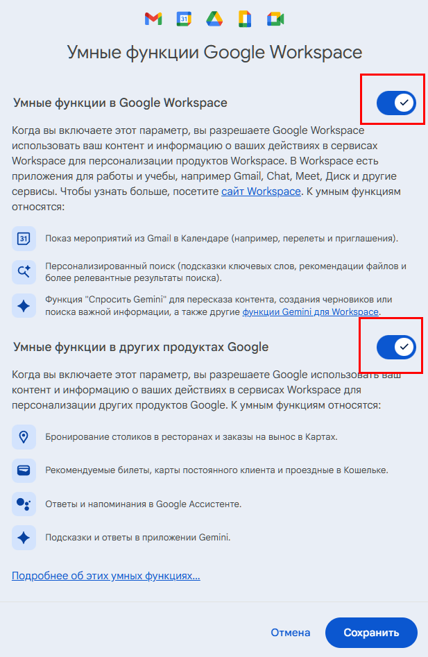 Сделайте всё то же самое, но дополнительно перейдите в подраздел «Умные функции в Google Workspace», снимите все галочки и нажмите «Сохранить».