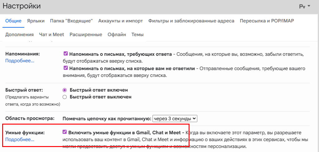 Откройте настройки Gmail (иконка шестерёнки → «Все настройки»). В разделе «Общие» найдите опцию «Умные функции» и снимите галочку с Включить умные функции в Gmail, Chat и Meet». В появившемся меню нажмите «Отключить и перезагрузить».