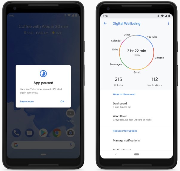 Одна из самых интересных фишек Android Pie — функция Digital Wellbeing, которая представляет из себя график с таймером, показывающим, как долго вы пользуетесь смартфоном в течение дня и в каких приложениях проводите больше всего времени. При желании можно установить лимит на использование любых приложений. Подобный контроль времени использования приложений реализован в бета-версиях iOS 12, но компания Google зашла ещё дальше и добавила в Android Pie возможность автоматического отключения цветов на экране, из-за чего изображение становится монохромным и менее привлекательным.