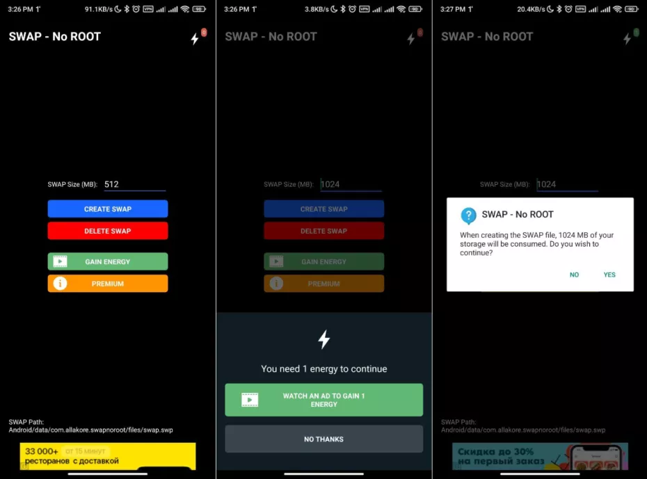 Укажите, сколько оперативной памяти вы хотите добавить. По умолчанию предлагается 512 МБ (0,5 ГБ), но можно выбрать больше. Приложение попросит посмотреть рекламу, после чего создаст файл подкачки выбранного размера. Этот файл будет использоваться приложениями в качестве расширения оперативной памяти.