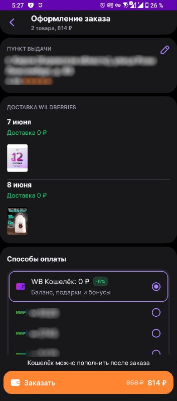 Не обязательно пополнять «WB Кошелёк» при оформлении заказа. Деньги на него можно перевести в тот момент, когда вы пойдёте получать товар, или непосредственно в ПВЗ, когда вы проверите его и удостоверитесь, что привезли нужную вам вещь. Впрочем, некоторые товары продаются только по предоплате, что бывает указано в корзине.