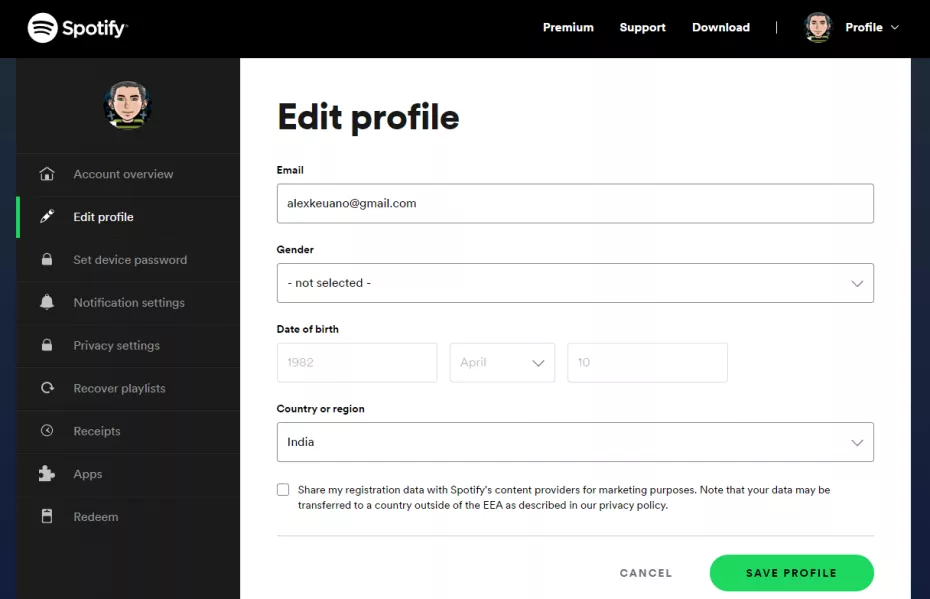 Запустите VPN с IP-адресом любой страны (кроме тех, где нет Spotify). Зайдите в настройки профиля и выберите страну, которой соответствует IP-адрес из VPN. После этого вы сможете использовать Spotify с бесплатным тарифом даже без VPN, но придётся хотя бы раз в две недели заходить в сервис с включенным VPN и снова выбирать в настройках чужую страну, иначе сервис перестанет работать.