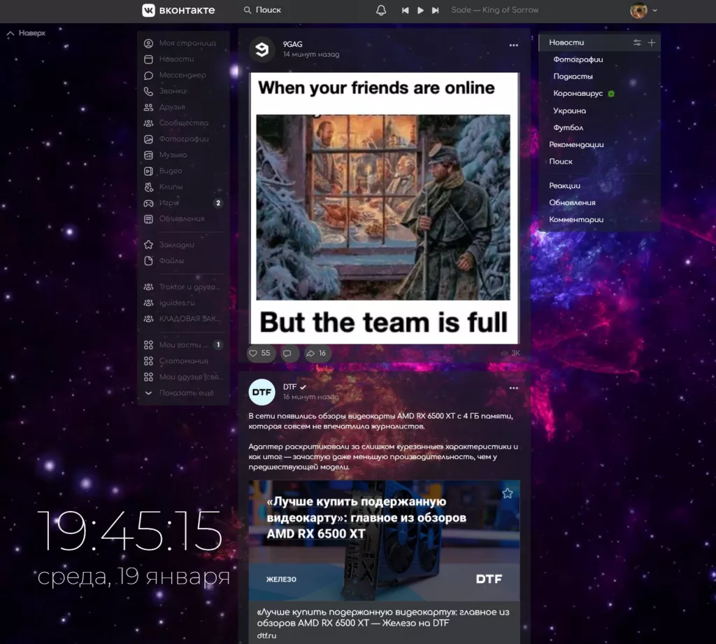 Самое крутое расширение (и это не реклама) — «VK Styles — Темы для вк». С его помощью можно слегка подрихтовать оформление «ВКонтакте», поменяв то, что вас раздражает, а можно полностью перекроить дизайн сайта, в том числе изуродовав его до жуткой кринжатины (как на скриншотах в этой статье). Расширение позволяет добавить фон, поменять шрифт, применить визуальные эффекты, сделать меню и карточки постов прозрачными и даже добавить часы с датой. Все опции настраиваются очень тонко.
