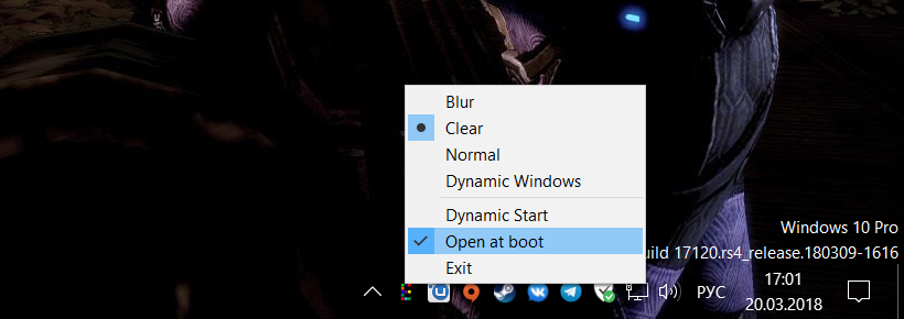 - Dynamic Windows — если окно открыто на весь экран, то панель отображается с эффектом Blur, не на весь экран — Clear.