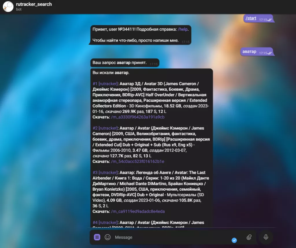 К счастью, технология Torrent не зависит от каких-либо сайтов, поскольку данные передаются от одних пользователей к другим напрямую между их компьютерами. В Telegram доступен чат-бот rutracker_org_test_bot (он же rutracker_search), который позволяет находить контент с «Рутрекера» в режиме чата: вы вводите поисковой запрос, а бот выдаёт вам результаты поиска. Любую раздачу можно скачать через торрент-программу с помощью magnet-ссылки. Там же отображается количество скачиваний и число раздающих.