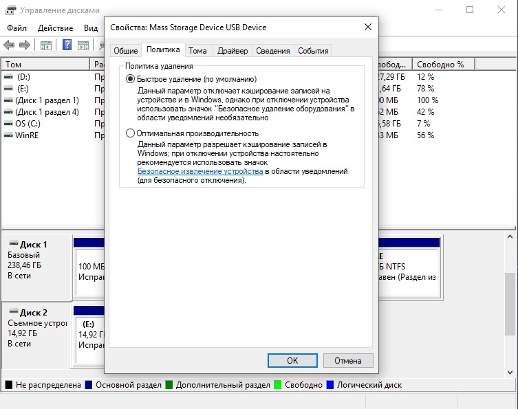 - Перейдите во вкладку «Политика» и посмотрите, какая политика удаления установлена для устройства. Выберите ту, которая вам нужна — безопасная или та, которая обеспечивает максимальную скорость записи и считывания данных.
