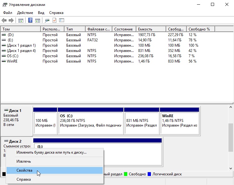 - Найдите внешний накопитель, нажмите на него правой кнопкой мыши и выберите «Свойства».