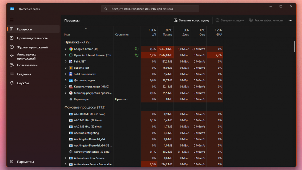 Закройте все приложения, чтобы они не мешали поиску вредоносных процессов. Нажмите правой кнопкой мыши на меню «Пуск» и запустите «Диспетчер задач». Отсортируйте задачи по уровню нагрузки на процессор, видеокарту, накопитель или интернет. Если какой-то процесс потребляет слишком много ресурсов и он вам не знаком, погуглите его название, он вполне может оказаться вредоносным.