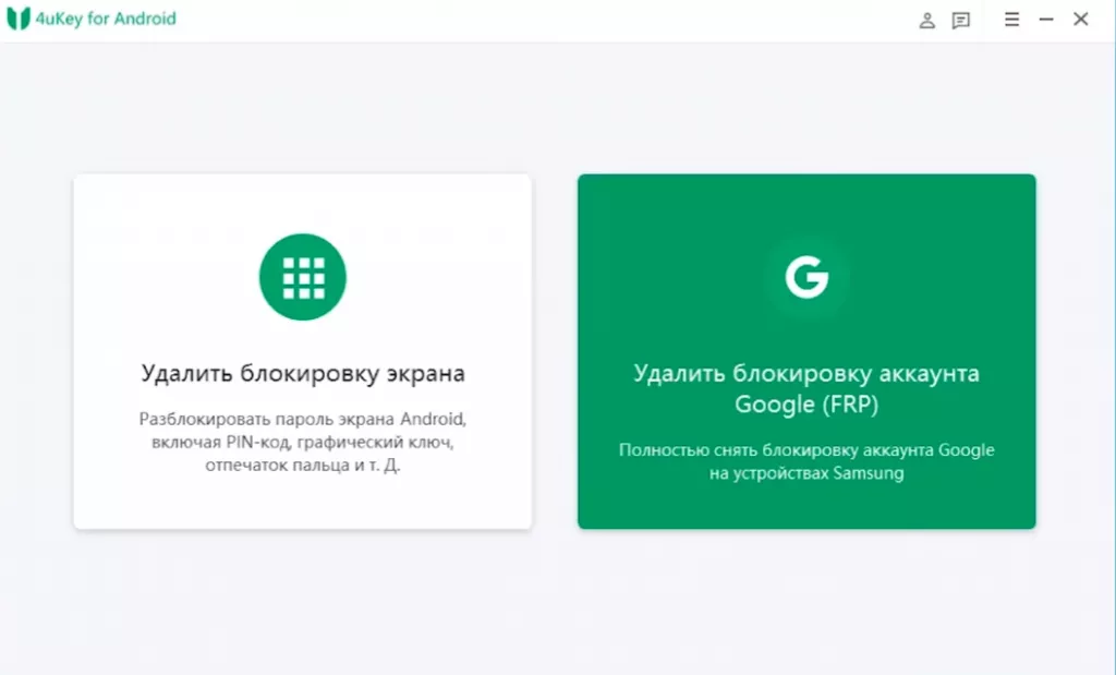 Скачайте программу 4uKey for Android с сайта разработчика на компьютер, установите её и запустите. На стартовом экране выберите «Удалить блокировку аккаунта Google (FRP)».