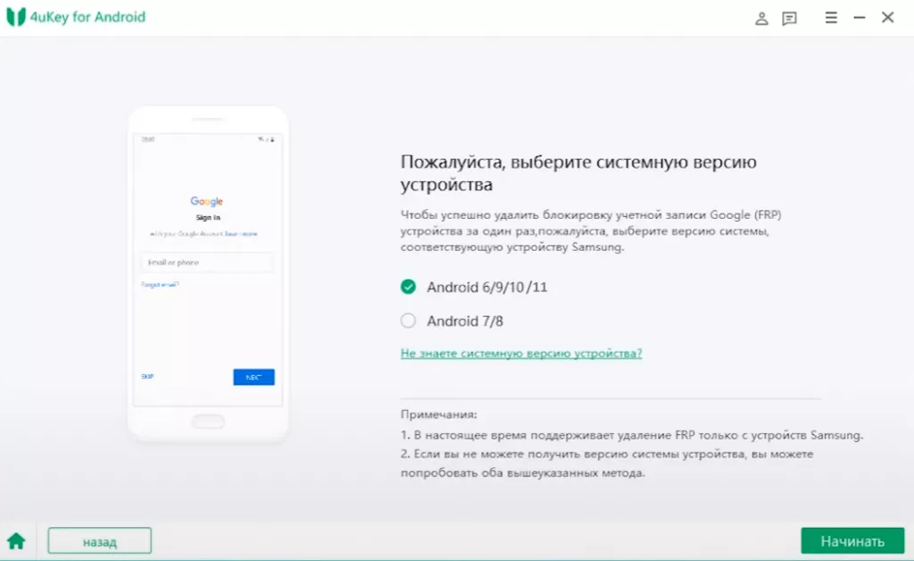 Выберите в 4uKey for Android версию Android, использующуюся на смартфоне. Нажмите «Начать» и следуйте инструкции в программе. В ходе разблокировки может потребоваться установить браузер и перейти на сайт Tenorshare для скачивания дополнительного софта.