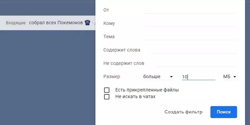 - Очистите все поля, а в поле «Размер» укажите, письма с вложениями какого размера вас интересуют (например, больше 10 МБ)