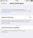 На экране «Состояние аккумулятора» отображаются сведения о максимальной емкости аккумулятора и пиковой производительности. В момент первого включения максимальная емкость составляет 100%, а затем, по мере химического старения аккумулятора, снижается, из-за чего время работы до следующей подзарядки становится меньше. Стандартный аккумулятор рассчитан на сохранение до 80% исходной емкости в течение 500 полных циклов зарядки.