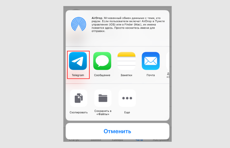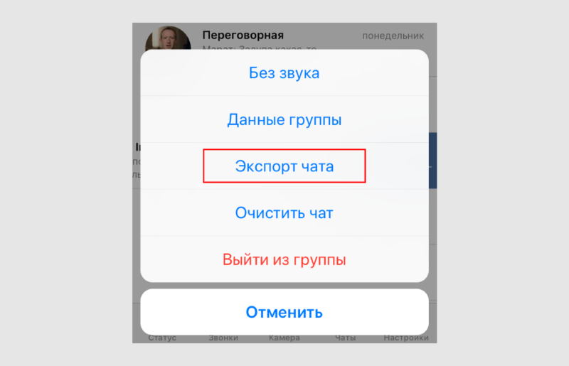 Откройте WhatsApp, найдите нужный чат, свайпните его влево, нажмите на меню «Ещё» и выберите опцию «Экспорт чата». Появится всплывающее окно для переноса данных, где есть в том числе Telegram — нажмите на значок этого мессенджера. В Telegram выберите контакт, в чат с которым будет перенесена переписка.