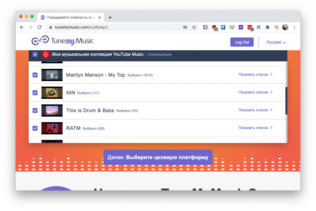 - После того как закончили с выбором нажимаем кнопку «Выберите целевую платформу». В следующем окне выбираем Spotify и заходим в свою учетную запись на нём.