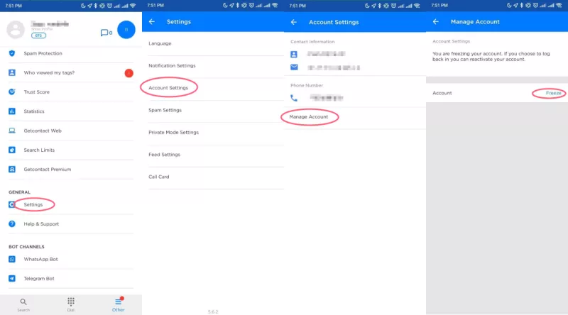 Откройте приложение GetContact, перейдите в «Настройки», затем в «Настройки аккаунта», далее в «Управление аккаунтом» и нажмите «Заблокировать».