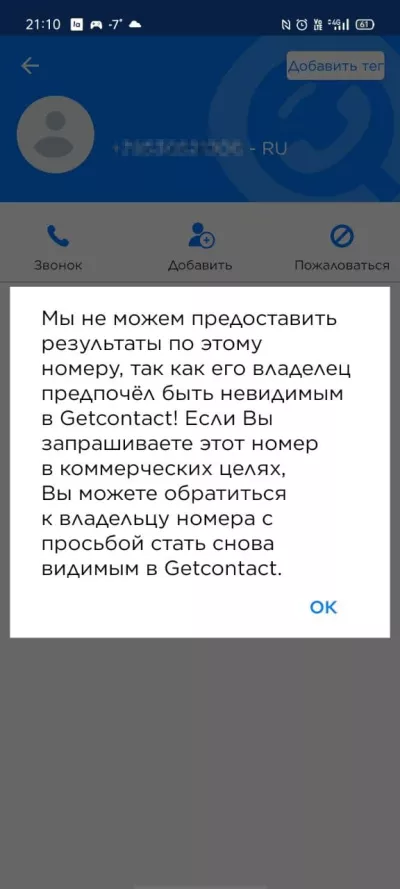 После этого другие люди при попытке найти информацию по вашему номеру в GetContact будут видеть сообщение о том, что вы предпочли скрыть её.