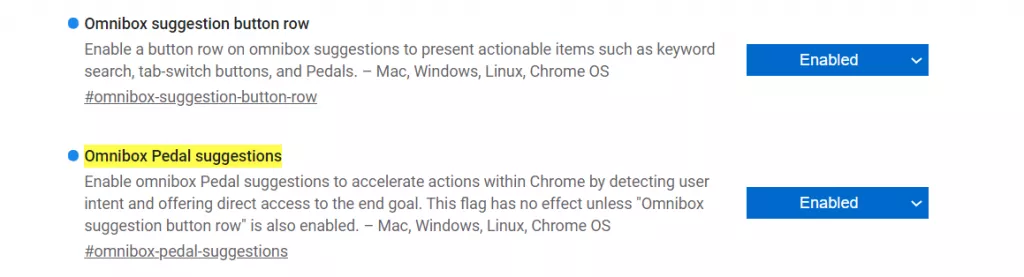 Пока что по умолчанию эта функция работает не у всех, однако это легко исправить — перейдите по ссылкам chrome://flags/#omnibox-pedal-suggestions и chrome://flags/#omnibox-suggestion-button-row, и принудительно включите эти настройки: