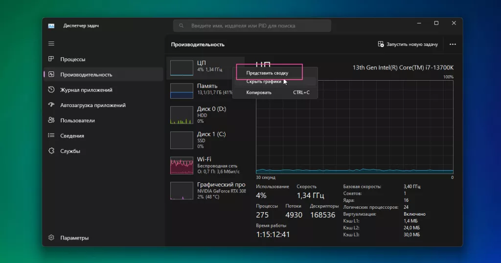 Перейдите к вкладке «Производительность» и дважды щёлкните левой кнопкой мыши на «ЦП», «Память», «Диск» или другой компонент системы (либо нажмите правой кнопкой мыши и выберите «Представить сводку»).