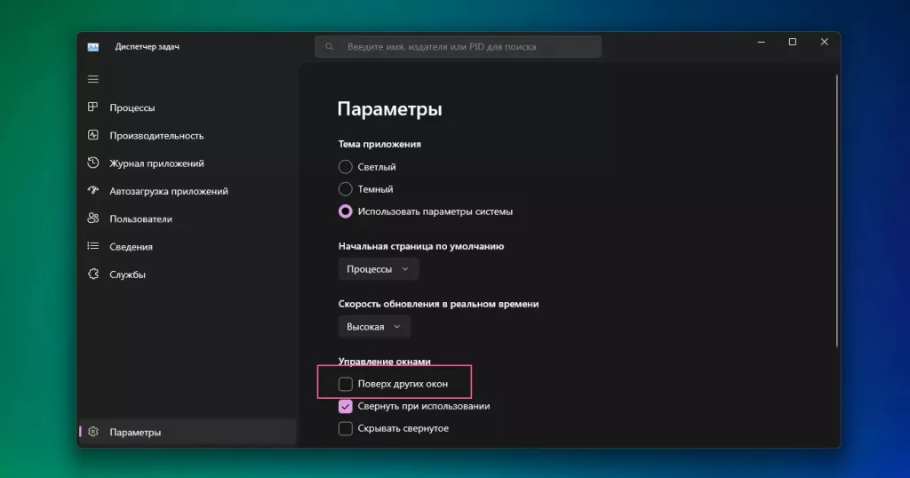 Запустите «Диспетчер задач» (через меню «Пуск» или горячим сочетанием клавиш Ctrl + Shift + Esc). Откройте «Параметры» и включите опцию «Поверх других окон».