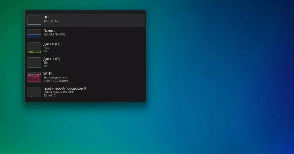 В виджете наглядно представлены графики нагрузки на процессор, оперативную память, накопители, проводную или беспроводную интернет-сеть и видеокарту. Он отображается поверх остальных окон, поэтому всегда виден. Можно изменить его размер или переместить его в любое место экрана. К сожалению, ему не хватает эффектов прозрачности и возможности прикрепления к рабочему столу.