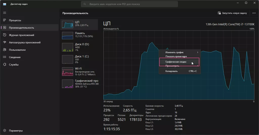 При желании можно сделать виджет, в котором мониторится лишь один из компонентов компьютера. Для этого выберите нужный компонент, нажмите на его график правой кнопкой мыши и выберите «Графическая сводка» — она появится в небольшом окне.