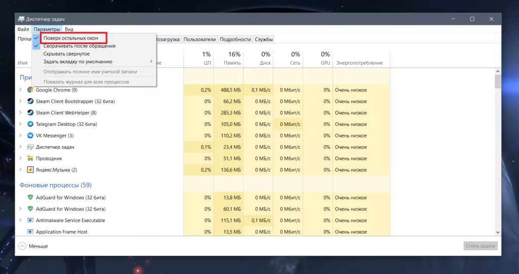 Microsoft постоянно улучшает диспетчер задач в Windows 10 — так, в майском обновлении он научился показывать температуру дискретной видеокарты. И не все знают, что его можно использовать как оверлей, следя за нагрузкой на систему в играх. Да, разумеется MSI Afterburner покажет вам гораздо больше информации, как и FPS Monitor, но для базового мониторинга диспетчера задач вполне хватит.