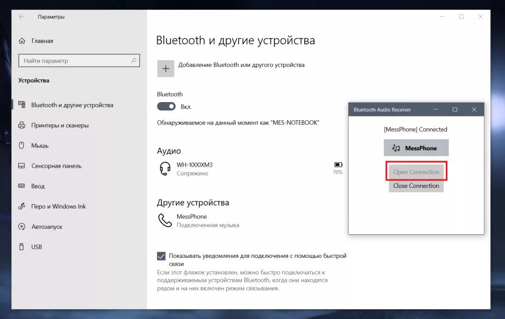 Для этого вам нужно обновить свое устройство до Windows 10 2004 (May 2020 Update), после чего поставить бесплатное приложение Bluetooth Audio Receiver из Microsoft Store. Теперь включите Bluetooth на вашем смартфоне (iPhone поддерживается), а на компьютере зайдите в Параметры > Устройства > Bluetooth и спарьте оба ваших гаджета. После этого остается только запустить установленное приложение, в нем выбрать ваш смартфон и нажать на Open Connection: