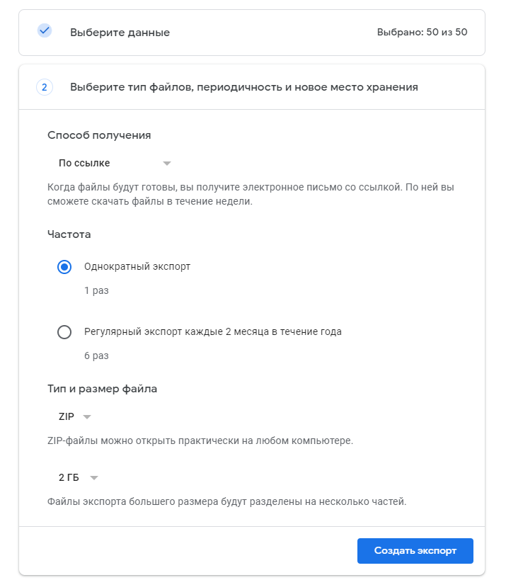 В том случае, если вы храните в сервисах Google большой объём данных (десятки или сотни гигабайт), создание архива может занять несколько дней. Чтобы ускорить этот процесс, выберите только те данные, которые вам действительно нужно сохранить.