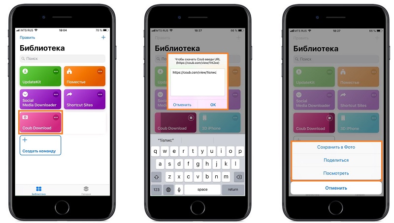- Чтобы скачать видео надо скопировать ссылку в буфер обмена и перейти в приложение «Команды» → Coub Download или можете вписать ссылку на видео.