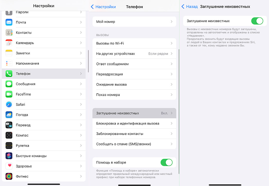 - В iOS 13 и новее можно заглушать все звонки с неизвестных номеров, чтобы их не пропустить.