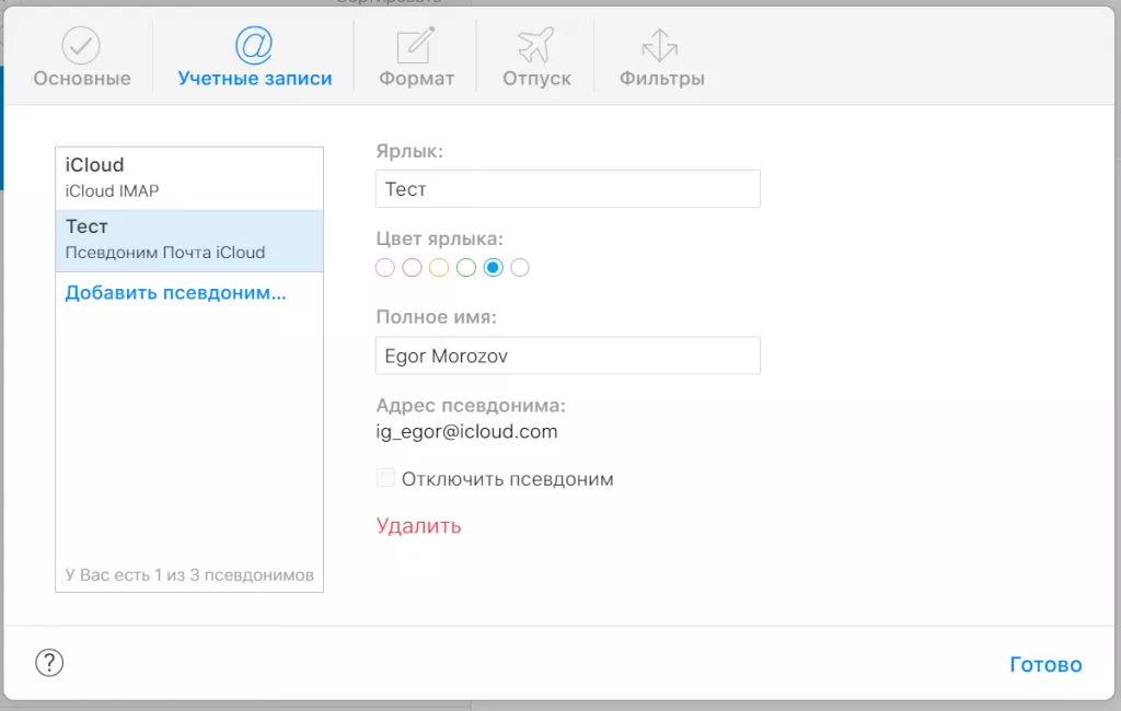 Если псевдоним вам больше не нужен, можете его отключить или удалить на той же вкладке «Учетные записи»: