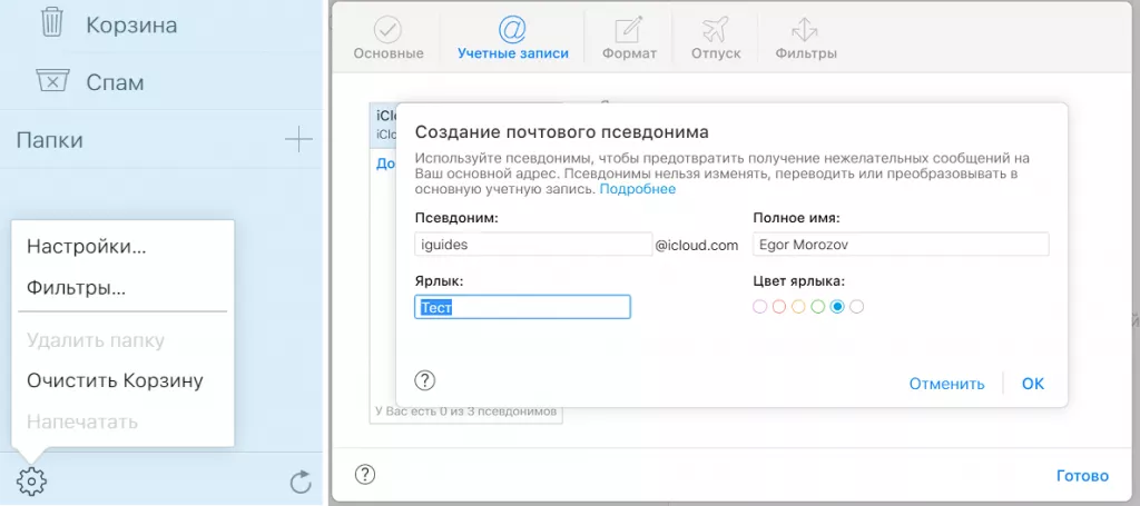 Как же завести псевдоним? Зайдите на сайт iCloud, нажмите на иконку Почты, далее на значок шестеренки > Настройки, перейдите на вкладку «Учетные записи» и нажмите на «Добавить псевдоним...»: