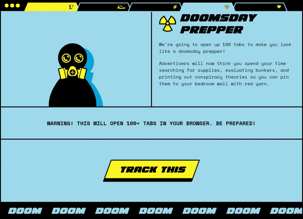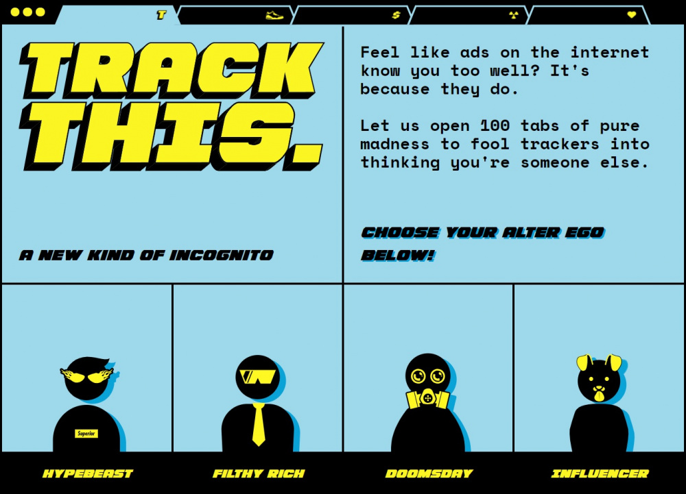 Track This действует экстремально: открывает более ста вкладок с соответствующей тематикой. Каждый открытый сайт сохраняет куки-файлы, на которые ориентируются рекламные сети. В результате у вас не будет ощущения, что за вами следят — даже если вы увидите какую-либо рекламу, она с большой вероятностью не будет связана с вашими интересами. Поначалу будет непривычно — как будто вы пользуетесь чужим компьютером.