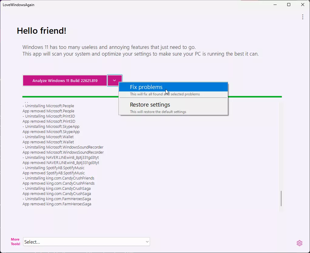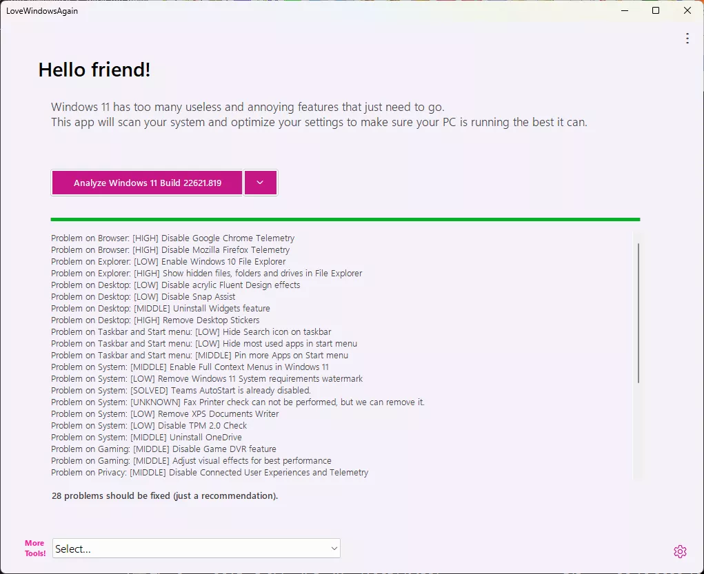 LoveWindowsAgain проверит, какие проблемы содержатся в вашей операционной системе — для этого нужно запустить анализ кнопкой Analyze Windows 11. Вы увидите список того, что можно исправить: отключить слежку через телеметрию в операционной системе и браузерах, убрать визуальные эффекты, деактивировать проверку шифрования, удалить бесполезные предустановленные приложения и т. п.