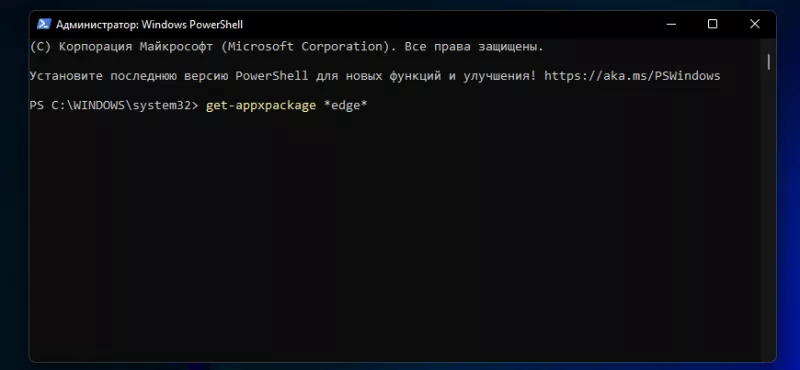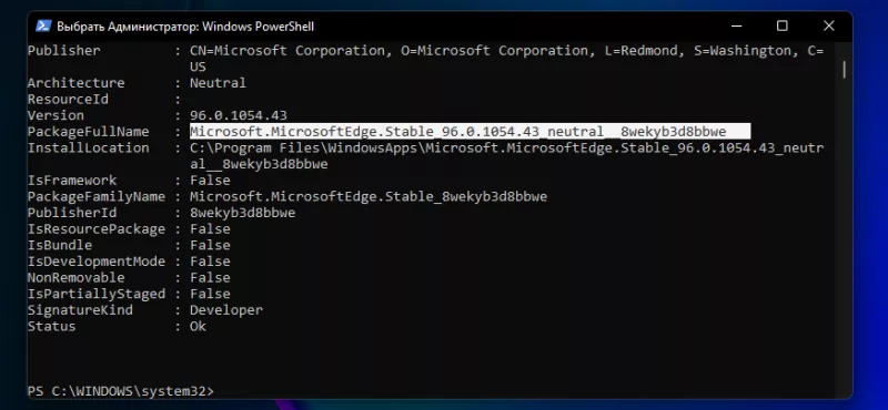 Введите команду get-appxpackage *edge* и нажмите Enter. Вы увидите информацию о Microsoft Edge, в том числе колонку с названием PackageFullName. Скопируйте значение после двоеточия (оно может отличаться на разных компьютерах).