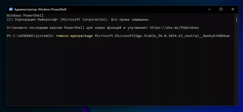Вставьте команду remove-appxpackage, затем пробел и скопированное ранее значение, нажмите Enter.