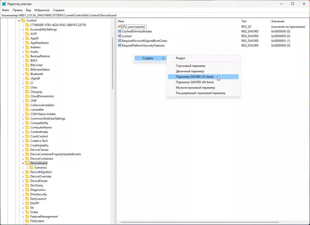 То же самое можно сделать через системный реестр. Запустите реестр (например, через Win + R с помощью команды regedit), перейдите в раздел HKEY_LOCAL_MACHINE\SYSTEM\CurrentControlSet\Control\DeviceGuard, создайте параметр DWORD (32 бита) с названием EnableVirtualizationBasedSecurity, дважды щёлкните по нему левой кнопкой мыши и присвойте ему значение 0. Перезагрузите компьютер.