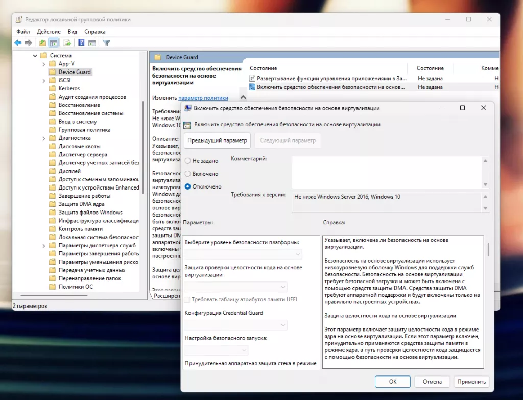 Аналогичные действия возможны через групповые политики. Откройте окно выполнить (Win + R), или поиск на панели задач или в меню «Пуск» и ведите команду gpedit.msc. Откройте утилиту «Редактор локальных групповых политик», перейдите в раздел «Конфигурация компьютера» → «Административные шаблоны» → «Система» → Device Guard и откройте параметр с названием «Включить средство обеспечения безопасности на основе виртуализации». Выберите опцию «Отключено», нажмите «ОК» или «Применить» и перезагрузите компьютер для применения новых настроек безопасности.