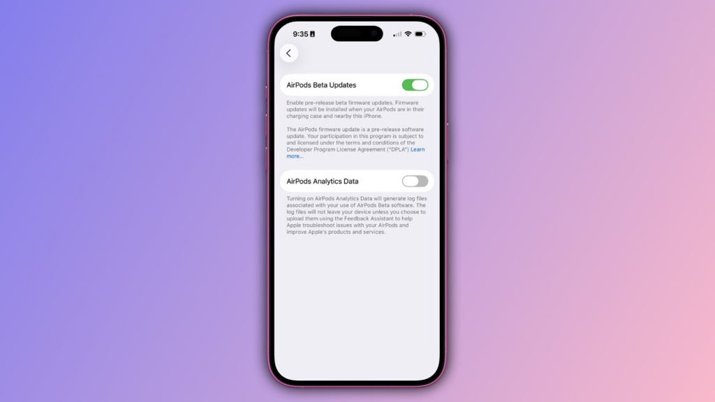 - Прокрутите вниз, нажмите «Обновления бета-версии AirPods» и переведите переключатель в положение «Включено»;