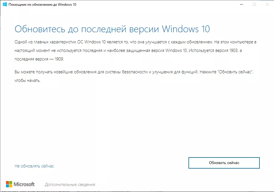 Перейдите по ссылке и скачайте файл Windows10Upgrade9252.exe. Запустите этот файл — «Помощник по обновлению до Windows 10» проверит совместимость вашего компьютера с Windows 10 November 2019 Update и наличие обновления. Если всё нормально — появится сообщение о возможности установки новой версии Windows 10 и кнопка «Обновите сейчас». Нажмите на эту кнопку.