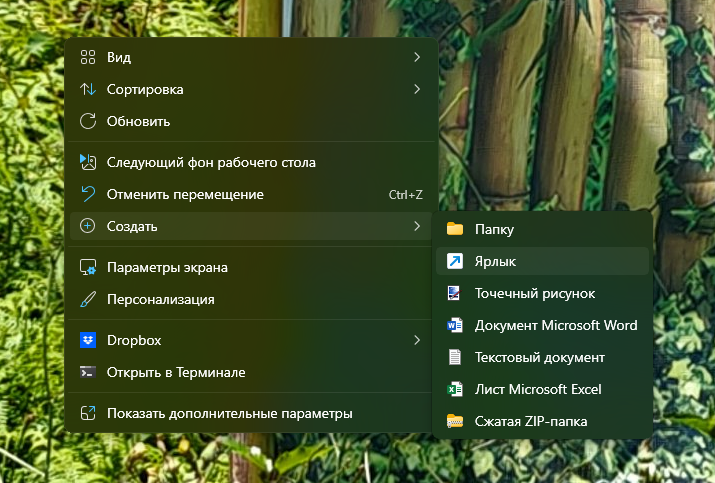 - Кликните правой кнопкой мыши на рабочем столе, выберите Создать → Ярлык.