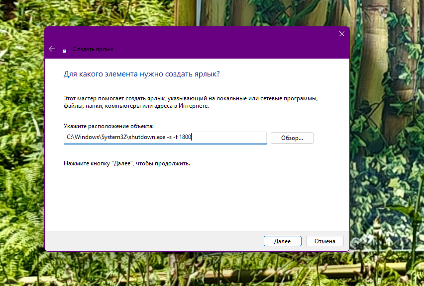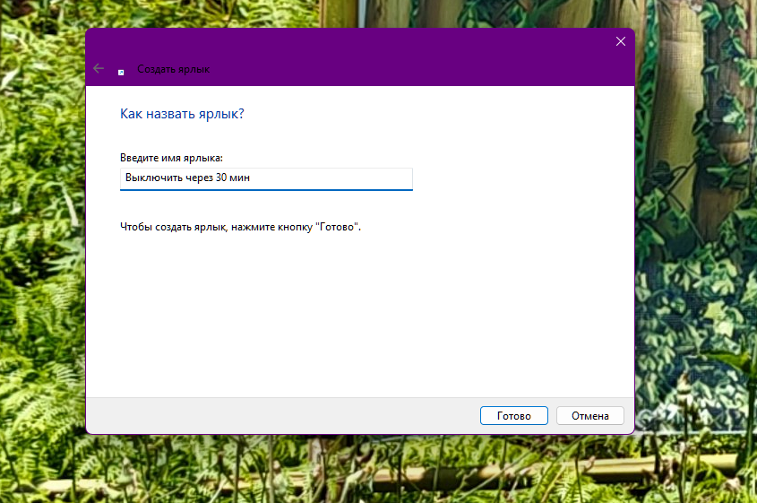 C:\Windows\System32\shutdown.exe -s -t 1800 - Задайте понятное имя, например, «Выключить через 30 мин».